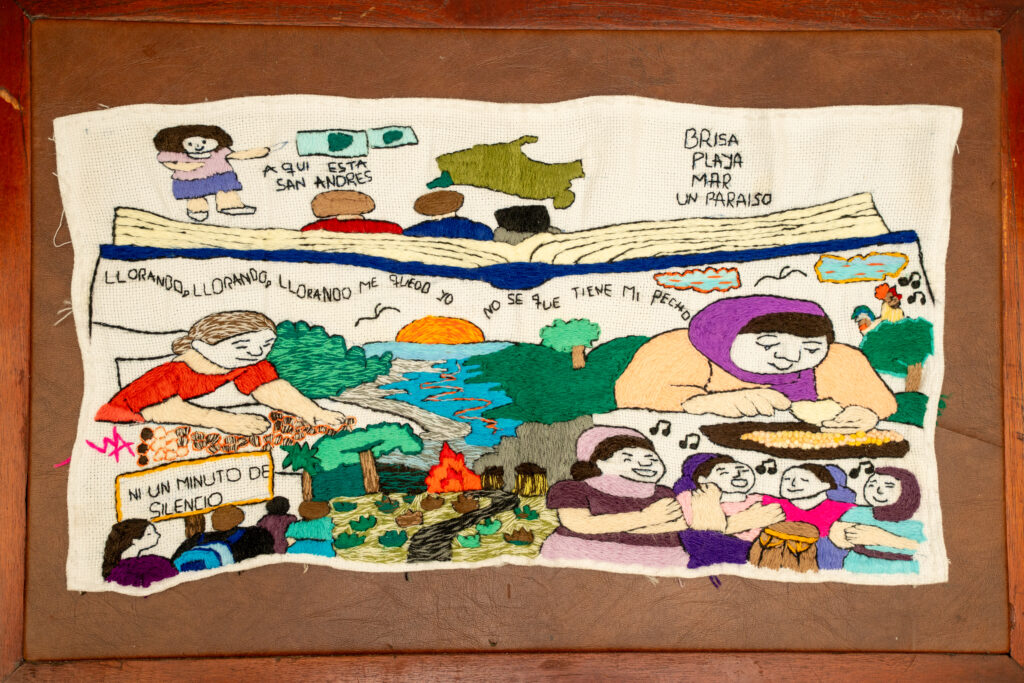 Este bordado traduce la distancia entre la teoría y la realidad de un territorio, donde cada color y forma se convierten en una invitación a la relectura, presentando las dualidades de un territorio, la forma como ha sido conceptualizado y abstraído desconociendo las fisuras de lo cotidiano y las historias de vida. Es un acto de resistencia, una manera de reescribir el espacio desde la experiencia, el cuerpo y la memoria.